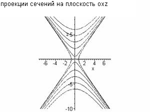 Теперь рассмотрим сечения данного гиперболоида плоскостями z=h, параллельными координатной плоскости Oxy. Линия, получающаяся в сечении, определяется уравнениями
