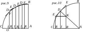 умма синусов какой–нибудь дуги (BF) четверти круга (рис. 9) равна отрезку основания (АО) между крайними синусами, умноженному на радиус (АВ).