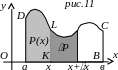 Для нахождения площади Р нашей трапеции рассмотрим сначала площадь Р(х) фигуры АDLK, отвечающей промежутку [а, х], где х – произвольно взятое на [а,в] значение. Для нахождения функции Р(х) построим приращение х и соответствующее ему приращение Р, если т и М предоставляют минимум, соответственно, максимум f(х) в промежутке [х, х+х], то, очевидно, будет иметь место неравенство