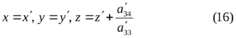 Подставляя х', у' и z' , найденные из (16) в левую часть (7) и заменяя затем a´33 на a33 , a´14 на р , a´24 на q и a´44 на r , получим следующее уравнение поверхности S в новой системе координат Охуz :