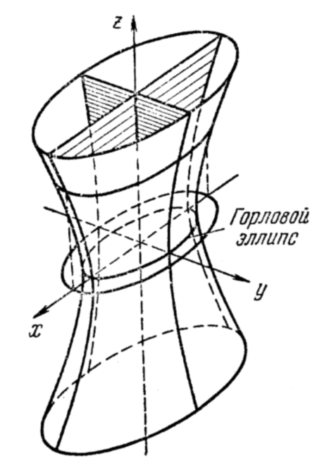 Из уравнения (4) вытекает, что координатные плоскости являются плоскостями симметрии, а начало координат — центром симметрии однополостного гиперболоида.