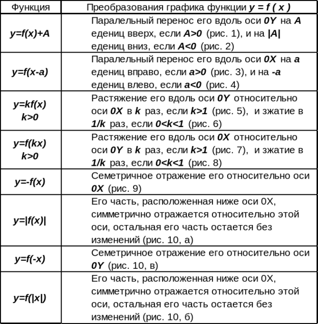 Применительно к графикам функций эти свойства дают те конкретные геометрические преобразования (табл. 1), использование которых позволяет из известного графика функции y=f(x) строить графики других функций (рис. 1 - 11).