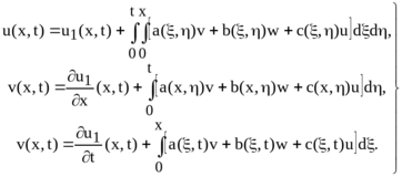 Розв’язок v(x, t, x1, t1) однорідного спряженого рівняння (6.4), який задовільнює умовам (6.5), називається функцією Рімана. Ця функція не залежить від початкових даних (1.2), та для неї точка (x, t) грає роль аргументу, а точка (x1, t1) – роль параметру. Існування та єдиність такої функції v було доказано методом послідовних наближень.