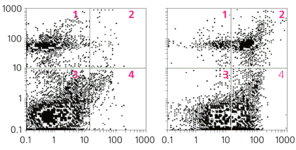 Рис.2. Экспериментальные результаты индукции апоптоза и некроза в суспензии нейронов: в контроле (слева) и после 30 мин инкубации в присутствии 0.5 мМ NMDA (справа). Цифрами указаны субпопуляции нейрональных клеток: живые (3), апоптозные (4), подверженные легкому (1) и тяжелому (2) некрозу.