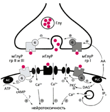Глутамат высвобождается из пресинаптического окончания и взаимодействует с ионотропными (иГлуР) и метаботропными (мГлуР) рецепторами (I, II и III) в зависимости от того, с какими вторичными мессенджерами они связаны - инозитолтрифосфатом, (IP3), циклическим АМФ, (сАМР), ионами кальция и ферментом аденилатциклазой (АС). Эти мессенджеры активируют различные внутриклеточные киназы (в том числе протеинкиназу С, РKС), регулирующие проницаемость ионных каналов постсинаптической мембраны. Избыточная продукция вторичных мессенджеров приводит к нейротоксичности. Метаботропные рецепторы группы I увеличивают высвобождение глутамата, а групп II и III - уменьшают его.