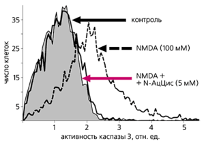 Инкубация лимфоцитов мыши с N-метил-D-аспартатом (NMDA) приводит к увеличению каспазной активности. Антиоксидант N-ацетилцистеин препятствует активации каспазы.