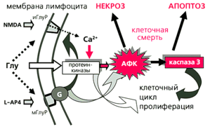 При взаимодействии глутамата (Глу) с ионотропными рецепторами (иГлуР) ионы кальция входят внутрь клетки, активизируют протеинкиназы и каспазу 3, которая стимулирует пролиферацию. Взаимодействие глутамата с метаботропными рецепторами (мГлуР) через G-белки стимулирует активность иГлуР, что приводит к дополнительной активации протеинкиназ и усиленному росту активных форм кислорода (АФК). В этом случае возможна индукция клеточной смерти как по пути апоптоза, так и по пути некроза. NMDA и L-AP4 имитируют раздельный эффект глутамата на иГлуР и мГлуР соответственно.