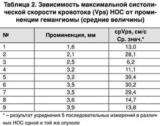 Изменение кровотока в новообразованных сосудах гемангиомы с учетом локализации патологического очага сопровождается увеличением максимальной систолической скорости кровотока во внутриопухолевых сосудах, что более демонстративно при юкстапапиллярной локализации гемангиомы. В среднем она оказалась выше, чем при макулярной и парамакулярной локализациях, и составила 24,6 см/с и 18,7 см/с соответственно. Т.о., при юкстапапиллярной локализации гемангиомы отмечается усиление скорости кровотока в среднем в 1,3 раза. Обнаруженные изменения можно рассматривать, как документальное подтверждение двойного кровоснабжения опухоли.