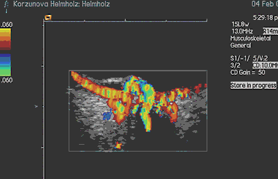Рис. 5. Цветовое допплеровское картирование юкстапапиллярной гемангиомы хориоидеи