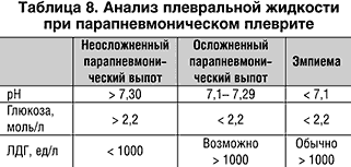 Парапневмонические плевральные выпоты могут значительно различаться по тяжести течения, варьируя от неосложненного выпота до развития эмпиемы плевры. Некоторые формы парапневмонического выпота не требуют специальной терапии, кроме антибактериальной терапии, в то время, как при эмпиеме может потребоваться хирургическое вмешательство. Биохимический анализ плеврального выпота позволяет разграничить три стадии парапневмонического плеврального выпота на основании трех параметров: рН, ЛДГ и глюкозы [16] (табл. 8).