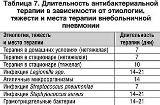 Длительность антимикробной терапии зависит от тяжести заболевания, этиологического фактора, наличия или отсутствия осложнений. Средняя длительность терапии представлена в таблице 7.