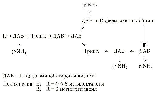 Все полимиксины воздействуют на цитоплазматическую мембрану бактериальной клетки, взаимодействуя с фосфолипидами. Они связываются с анионными участками мембраны и по характеру действия напоминают катионные детергенты. Повреждение структуры мембраны приводит к изменению ее проницаемости как для внутри-, так и внеклеточных компонентов [ 44, 66].