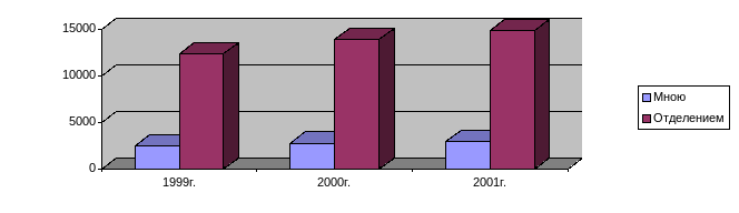 Наблюдается некоторое уменьшение числа исследований в отделении в 1999 году и небольшой рост в 2000 году, в общем - колебания небольшие. Увеличение моей нагрузки в 1999 и 2000 году связано с тем, что два врача находились в очередном отпуске. Врачи отделения имеют широкую подготовку, владея основами всех методик, применяемых в отделении, но существует условная специализация, с взаимозаменяемостью. С возрастанием нагрузки по эхотомоскопии, у меня отмечается снижение ее по функциональной диагностике. В результате общая нагрузка по рабочим единицам остается в пределах средней по отделению. Таким образом, при отсутствии одного или нескольких врачей в отделении, дополнительная нагрузка распределяется между работающими, по различным направлениям при этом учитывается квалификация по той или иной методике. Основным профилем моей работы является ультразвуковая диагностика органов брюшной полости, эхокардиоскопия и исследование щитовидной железы.