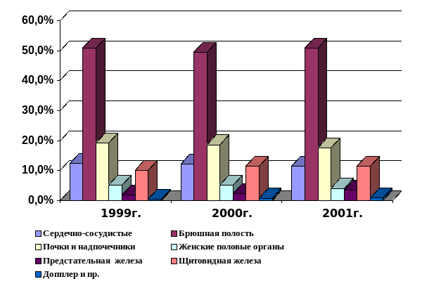 В 2001 году практически увеличилось количество всех исследований равномерно. Больше стало проводиться полостных исследований- трансвагинальные и трансректальные, доплеровское исследование сосудов.