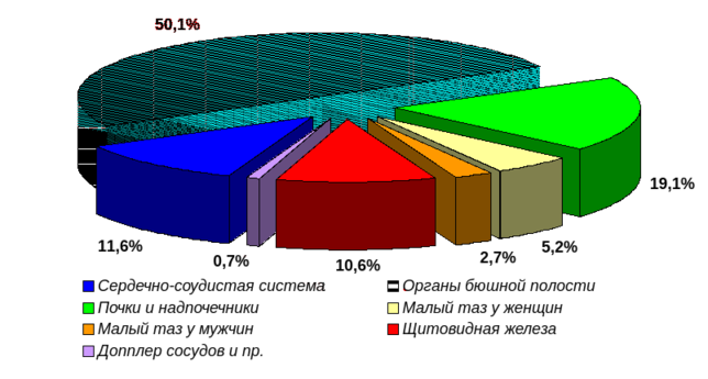 Значительное увеличение количества исследований предстательной железы- + 48%, УЗДГ сосудов + 42%, и дополнительных исследований - УЗИ молочных желез, орбит, плевры, суставов + 133%.