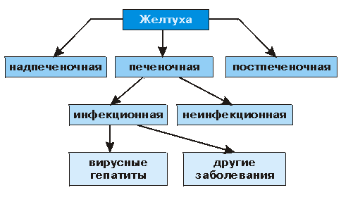 ричины желтух разнообразны, схематически их связь с различными факторами представлена на схеме.