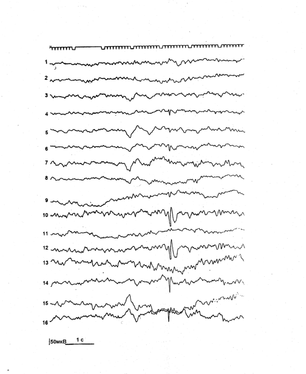 Электроэнцефалография. (рисунок. 9.) Биоэлектрические ритмы диффузно изменены. В отведениях от задних отделов по­лушарий отмечается тенденция к синхронизации альфа - ритма, в отведениях от средних отделов полушарий - большое коли­чество тета - волн с синхронизацией тета - ритма. В тех же отведениях регистрируются ЭЭГ феномены в виде комплексов острая волна - медленная волна. Регистрируются ЭЭГ признаки повышенной пароксизмальной готовности мозга.