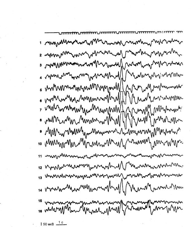1-16 – отведения: 1 – правое лобное; 2 – левое лобное; 3 – правое лобно-центральное; 4 – левое лобно-центральное; 5 правое центрально-теменное; 6 – левое центрально-теменное; 7 – правое теменно-затылочное; 8 – левое теменно-затылочное; 9 – правое лобно-височное; 10 – левое лобно-височное; 11 – правое центрально-височное; 12 – левое центрально-височное; 13 – правое теменно-височное; 14 – левое теменно-височное; 15 – правое височно-затылочное; 16 – левое височно-затылочное.
