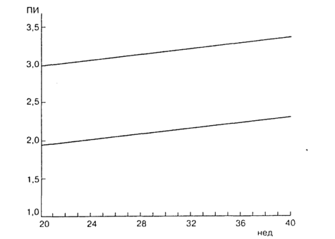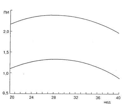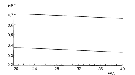 Снижение ИР с 0,95±0,015 в 19-22 недели до 0,71±0,09 в 38-41недель.