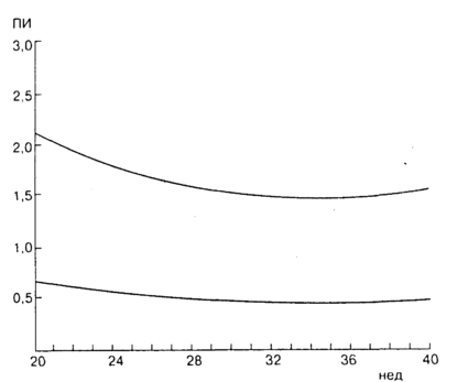 Во 2 половине беременности числовые значения ИСС маточной артерии стабильные, несколько снижаясь к концу беременности.