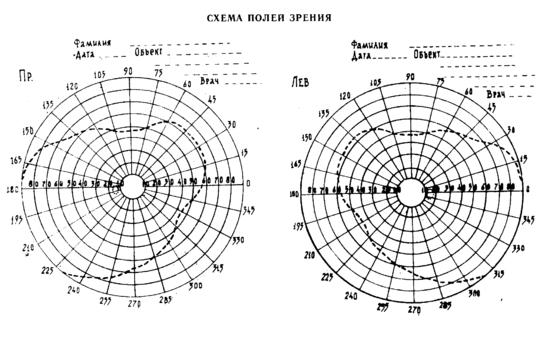Острота зрения, цветоощущение в норме. Поля зрения определяются в полном объёме.