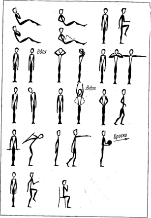 9. И. п.— стоя, медицинбол перед грудью. Броски медицинбола от груди, сбоку, из-за головы. 2—4 раза каждый вид броска. Дыхание не задерживать.