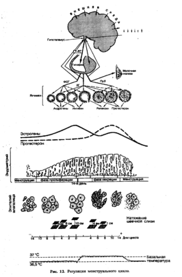 енструальный цикл —одно из проявлений сложного биологического процесса в организме женщины, характеризующегося циклическими изменениями функции половой (репродуктивной) системы, сердечно-сосудистой, нервной, эндокринной и других систем организма. Нормальный менструальный цикл включает 3 компонента: 1) циклические изменения в системе гипоталамус — гипофиз — яичники; 2) циклические изменения в гормонально-зависимых органах (матке, маточных трубах, влагалище, молочных железах); 3) циклические изменения (колебания функционального состояния) нервной, эндокринной, сердечно-сосудистой и других систем организма (рис. 12).