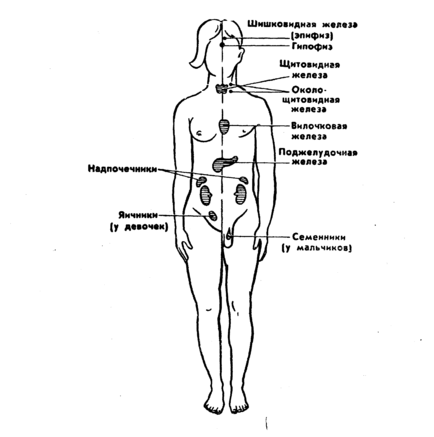 Под влиянием гормонов гипофиза усиливается рост тела в длину. Гипофиз также стимулирует деятельность щитовидной железы, отчего, особенно у девочек, во время полового созревания заметно увеличивается щитовидная железа. Возросшая активность гипофиза приводит к усилению деятельности надпочечников, начинается активная деятельность половых желез, усиливающаяся секреция половых гормонов приводит к развитию так называемых вторичных половых признаков — особенностей телосложения, оволосения, тембра голоса, развитию молочных желез. Половые железы и строение половых органов относят к первичным половым признакам.
