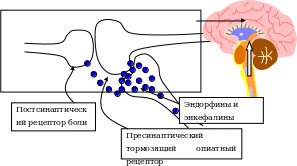 Рисунок 1. Тормозное модуляторное и тормозное нейротрансмиттерное пресинаптическое действие эндорфинов и энкефалинов