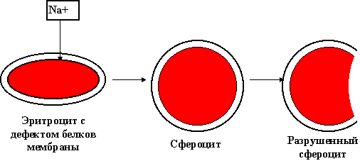 В основе заболевания лежит генетический дефект белка мембраны эритроцита. Имеющаяся аномалия мембраны приводит к проникновению в эритроцит избытка ионов натрия и повышенному накоплению в нем воды, вследствие чего образуются сферические эритроциты (сфероциты). Сфероциты, в отличие от двояковогнутых нормальных эритроцитов, не обладают способностью деформироваться в узких участках кровотока, например при переходе в синусы селезенки. Это ведет к замедлению продвижения эритроцитов в синусах селезенки, отщеплению части поверхности эритроцита с образованием микросфероцитов (отсюда название болезни - микросфероцитоз) и постепенной их гибели. Разрушенные эритроциты поглощаются макрофагами селезенки. Постоянный гемолиз эритроцитов в селезенке ведет к гиперплазии клеток ее пульпы и увеличению органа. В связи с усиленным распадом эритроцитов в сыворотке повышается содержание свободного билирубина. Поступающий в повышенном количестве в кишечник билирубин выводится из организма с мочой и главным образом с калом в виде стеркобилина. Суточное выделение стеркобилина при наследственном микросфероцитозе превышает норму в 10 - 20 раз. Следствием повышенного выделения билирубина в желчь является плейохромин желчи и образование пигментных камней в желчном пузыре и протоках.