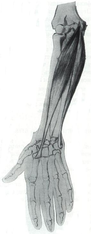 и которых кисть совершает боковые движения. Для сгибания и разгибания эти мышцы менее употребимы, так как их сухожилия прикрепляются к самому запястью, - значит, слишком близко к оси вращения, т.е. при этих движениях требуется большая затрата энергии и, следовательно, они более утомительны.