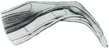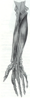 Сухожилия межкостной мышцы, начинающейся на боку пястной кости и дополняющей её мышцы соединяются с сухожилием разгибателя над первой фалангой. На рисунке видно, что сухожилие поверхностного сгибателя раздваивается, чтобы пропустить сухожилие глубокого сгибателя, прикрепляющегося на кончике пальца.