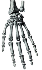 Пальцы рук имеют по три фаланги (рис. 7), исключение составляет первый (большой) палец, у которого только две фаланги. Он отличается наибольшим объёмом движений, так как его основной сустав находится на границе пясти и запястья. Пальцевые фаланги сочленяются с пястными костями. Пястные кости – одна на каждый палец – сочленяются со вторым рядом костей запястья.