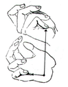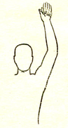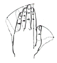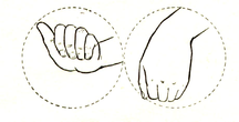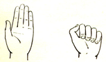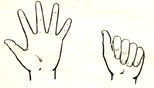 ) б) (рис. 1а). Все пальцы, кроме большого, опускают на ладонь с лёгким нажимом. Ногтевые фаланги при этом не сгибают (рис. 1б), затем поднимают большой палец и ударяют им по сочленению между вторым и третьим суставами указательного пальца.