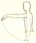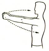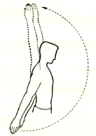стороны, проделывают вращательные движения предплечьем при фиксированном плече. Стараются, чтобы предплечье двигалось как можно более близко к плоскости плеча. Одновременно вращают и кисть, увеличивая объём размаха. Упражнение выполняют поочерёдно правой и левой рукой (рис. 16).