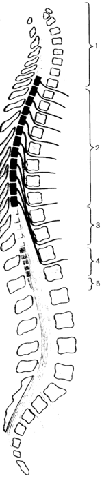 Положение сегментов по отношению к позвонкам можно определить следующим образом. Верхние шейные сегменты расположены на уровне соответствующих их порядковому номеру тел позвонков. Нижние шейные и верхние грудные сегменты лежат на один позвонок выше, чем тела соответствующих позвонков. В среднем грудном отделе эта разница между соответствующим сегментом спинного мозга и телом позвонка увеличивается уже на 2 позвонка, в нижнем грудном — на 3. Поясничные сегменты спинного мозга лежат в позвоночном канале на уровне тел X, XI грудных позвонков, крестцовые и копчиковый сегменты — на уровне XII грудного и 1 поясничного позвонков.