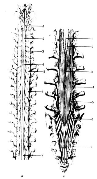 нервов и вместе с ними находится в заканчивающемся мешке, образованном твердой оболочкеi спинного мозга. У взрослого человека внутренняя часть терминальной нити имеет длину около 15 см. Ниже уровня крестцового позвонка терминальная нить представляет собой соединительнотканное образование, являющееся продолжением всех трех оболочек спинного мозга и получившее название парной части терминальной нити. Длина этой части около 8 см. оканчивается она на уровне тела II копчикового позвонка, срастаясь с его надкостницей.