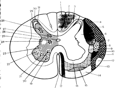 1 — fasc. gracitis; 2 - fasc. ciineatus; 3 fasc. proprilis dorsalis posterior], 4—tr. spinocerebellaris dorsalis (posterior]; 5 tr. corticospinalis (pyraimidalis) lateralis; 6— fasc. proprius lateralis; 7 -tr. rubrospinalis; 8-- tr. spinothalamicus lateralis; 9- -tr. vestiblilospinalis dorsalis posterior (BNA); 10—tr. spinocerebellaris ventralis [anterior); 11 tr. spinoteclalis; 12 tr. olivospinalis; 113—tr. reticulospinalis ventralis (anterior]; 14 tr. vestibulospinalis; 15- tr. spinothalamicus ventralis (anterior]; 16 fasc. proprius ventralis [anterior]; ,17— tr. corticospinalis (pyramidalis) ventralis [anterior]; 18--tr. tectospinalis; 19—nucl. ventromedialis; 20 - nucl. dorsomedialis; 21 -nucl. centralis; 22— nucl. ventrolateratis; 23 nucl. dorsolateralis; 24 columna intermediolateralis; 25 -miel. intermediomedialis (BNA); 26--canalis centralis; 27- columna thoracica; 28 nucl. proprius cormi posterior (BNA): 29—zona terminalis (BNA); 30 zona spongiosa (BNA); 31 substantia gelatinosa.