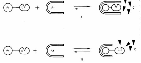 Рис. Варианты гомогенного иммуноферментного анализа (А- эффект разобщения фермента (Ф) и субстрата (С) за счет стерических препятствий при взаимодействии антигена (Аг) и антитела (Ат); Б- эффект изменения конформации фермента при формировании комплекса антиген- антитело.