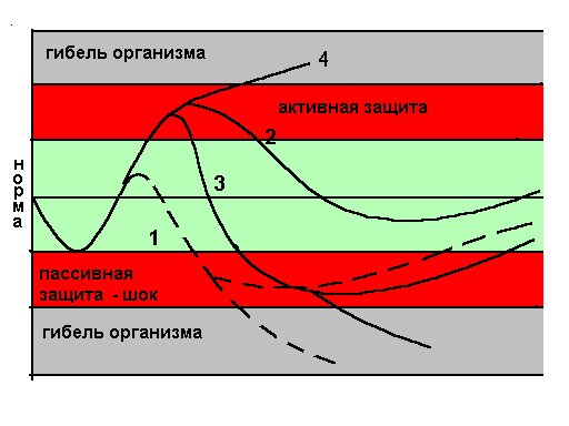 Совершенно иные изменения происходят при несостоятельности активных форм защиты. Генерализованная стимуляция деятельности систем в большинстве случаев сменяется их угнетением. Повышенную активность сохраняют лишь те системы, которые обеспечивают неспецифическую резистентность организма (гипофизарно-адреналовая, симпатико-адреналовая и др.)