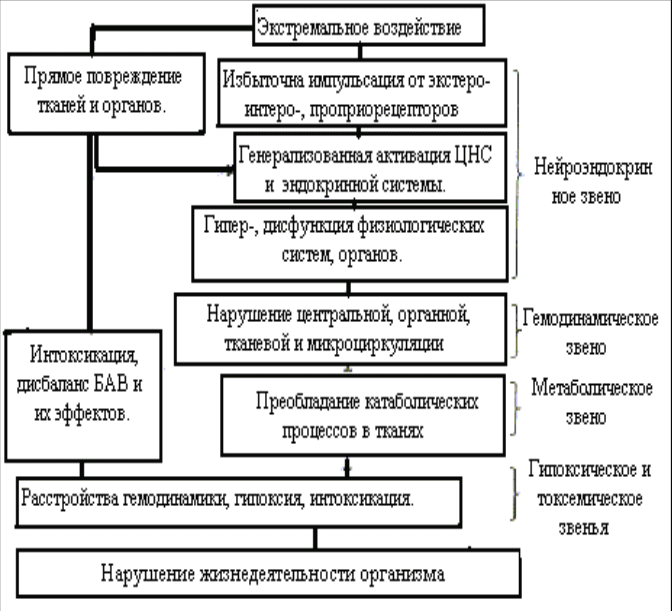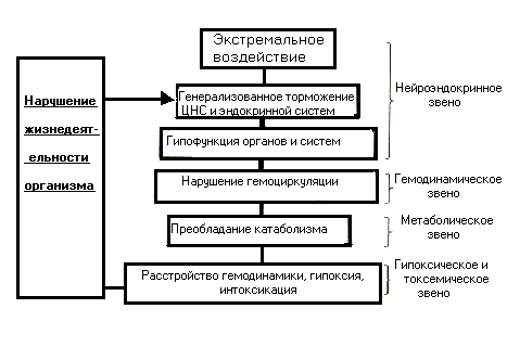 Для ответа на вопрос, звучащий в названии этого реферата необходимо также сравнить причины гемодинамических расстройств при шоке, коллапсе и массивной острой кровопотере. Считается, что при шоке изменения кровообращения возникают вторично, главным образом в результате нарушения деятельности центральной нервной системы. Экстремальное воздействие (этиологический фактор шока) действует двояко : вызывает прямое повреждение тканей и органов, а также вызывает избыточную афферентную импульсацию от экстерорецепторов, интерорецепторов и проприорецепторов. Оба этих процесса вызывают генерализованную активацию нервной и эндокринной систем, это приводит к гиперфункции и дисфункции различных физиологических систем, что и является причиной гемодинамических расстройств. В общем виде основные звенья патогенеза шока представлены на рисунке 2.