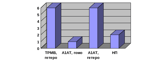 Встановлено, що у 15 (14,7 %) із 102 хворих були наявні генетичні мутації: у 2 виявлено мутацію спадкового панкреатиту, у 6 – гетерозиготна мутація гену муковісцидозу, у 1 – гомозиготна мутація, що призводила до дефіциту α1-антитрипсину, та у 6 – гетерозиготність по цій мутації.