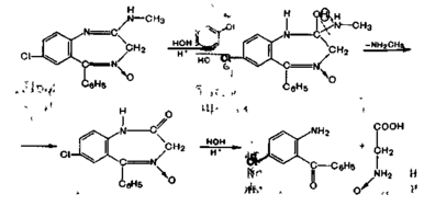 Щелочной гидролиз. При щелочном гидролизе в жестких условиях (сплавление с натрия гидроксидом или кипячение с раствором щелочи) из амидной группы бензо-диазепинов образуется аммиак или метиламин (сиба-зон), окрашивающие влажную красную лакмусовую бумагу в синий цвет. При этом нозепам образует на стенках пробирки налет изумрудно-зеленого цвета. Реакция сплавления со щелочью используется для идентификации 1,2-дигидро-ЗН-1,4-бензодиазепин-2-онов.