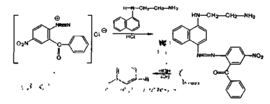 Соль диазония, полученную из нитразепама, сочетают в кислой среде с N-1-нафтилэтилендиамином; образуется азокраситель красного цвета: