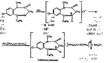 Бензодиазепины как азотсодержащие основания могут давать реакции с осадочными реактивами. Например, сибазон образует розовый осадок с аммония рейне-катом в кислой среде: