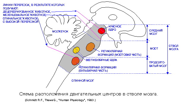 Влияния на двигательную деятельность спинного мозга возникают, в основном, при раздражении ретикулярной формации заднего мозга. Участки, которые создают эти эффекты, в настоящее время довольно хорошо определены, они совпадают с гигантоклеточным ядром ретикулярной формации продолговатого мозга и ретикулярным ядром моста. Эти ядра содержат большие клетки, аксоны которых образуют ретикулоспинальные пути.