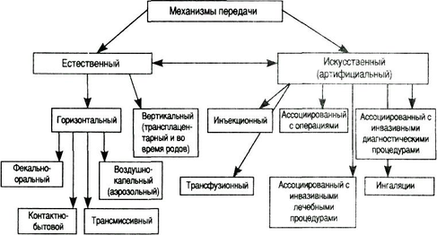 Полиэтиологичность ВБИ и многообразие источников возбудителей различных нозологических форм предопределяют многообразие механизмов, путей и факторов передачи (рис. 1), имеющих свою специфику в стационарах разного профиля. Вместе с тем есть ряд общих моментов, которые способствуют или препятствуют распространению возбудителей. В первую очередь это планировка больничных помещений, санитарно-гигиенические условия стационара, процедурных и диагностических кабинетов.