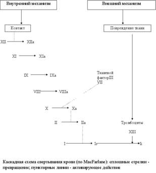 Имеется два различных механизма активации свертывания крови. Один обозначается как внешний механизм, поскольку запускается поступлением из тканей или из лейкоцитов крови тканевого фактора (фактор III). При взаимодействии с фактором VII , быстро активируется Х фактор, который трансформирует протромбин (II) в тромбин (IIa), а тромбин в свою очередь преобразует фибриноген (I) в фибрин (Is). Второй путь активации называется внутренним, он начинается с активации XII фактора. Это возникает вследствие разных причин - контакт крови с поврежденной сосудистой стенкой, с измененными клеточными мембранами, под влиянием адреналина или протеаз. Далее процесс идет по каскаду как это видно на рисунке, в конце концов, протромбин переходит в тромбин, а тот в свою очередь переводит фибриноген в фибрин и образуется тромб.