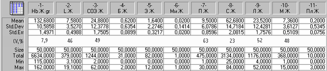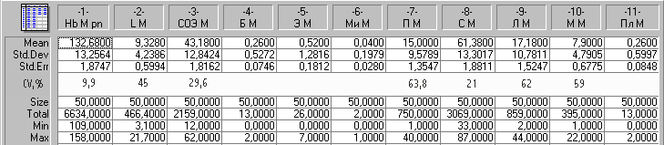 Средние значения гемоглобина 132 1,49 г/л у женщин и 141 2,06 г/л у мужчин (коэффициенты вариации от 7-10%) - в пределах среднестатистических норм, Количество лейкоцитов от 7,5 0,49 у женщин и 7,9 0,38 у мужчин - незначительно повышены, если учитывать нормы сибирского региона 3-6 тыс. Средний показатель СОЭ 24,8 1,75 мм у женщин и 27,5 2,35 мм у мужчин относительно повышен. В лейкоцитарной формуле проявляется тенденция к палочкоядерному сдвигу нейтрофильной популяции лейкоцитов (от 9,5 0,85 % у женщин и 9,6 0,4% у мужчин, причем коэффициент вариации очень большой. Средние значения лимфоцитов снижены и варьируют от 52 до 56%. Среднее количество эозинофилов и у мужчин и у женщин в пределах нормы.