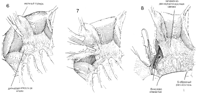 Оставляют маленький мягкий резиновый дренаж вдоль щели в печени, откуда был удален желчный пузырь. Этот дренаж проходит по отверстию Уинслоу и располагается в кармане Моррисона выше почки и латерально к позвоночному столбу. Рекомендуется выводить этот дренаж наружу через отдельную колотую рану, расположенную так, чтобы обеспечить косой тракт без изгибания вокруг края печени. Дренаж прикрепляют к коже шелковым швом и булавкой.